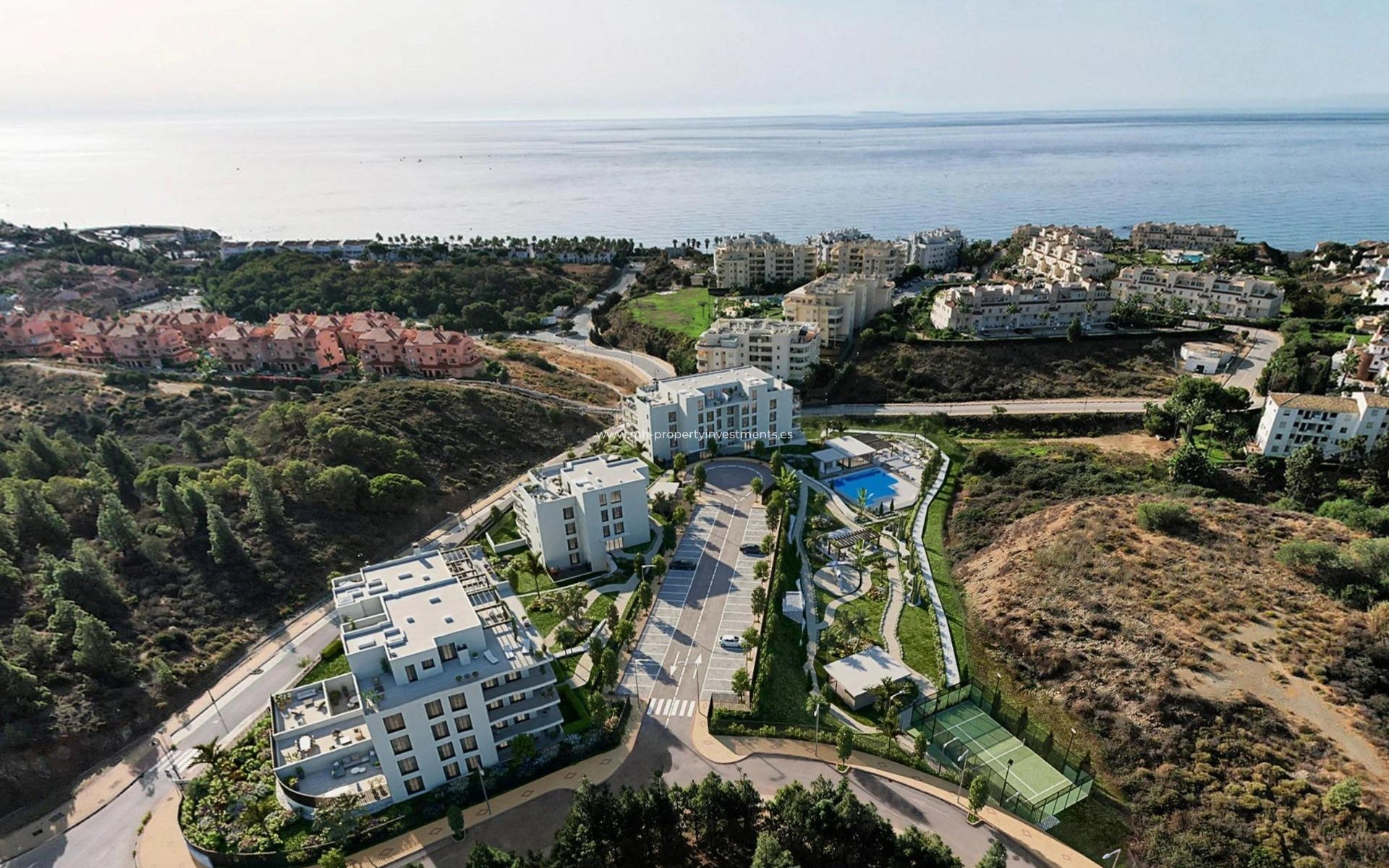 Das Projekt zeichnet sich durch seine natürliche Umgebung und die atemberaubende Aussicht aus. Die Wohnungen sind so ausgerichtet, dass sie das Tageslicht optimal nutzen. So können Sie von den Terrassen aus den Sonnenaufgang und den Sonnenuntergang mit Blick auf das Mittelmeer und die umliegenden Pinienwälder genießen. Die Anlage bietet über 7.000 m² Grünflächen, darunter sorgfältig angelegte Gärten, einen Paddle-Tennisplatz und einen Sitzbereich im Freien. Diese Außenbereiche bieten eine ruhige und entspannende Umgebung, ideal für Spaziergänge und die Verbindung zur Natur, ohne das Gelände zu verlassen.