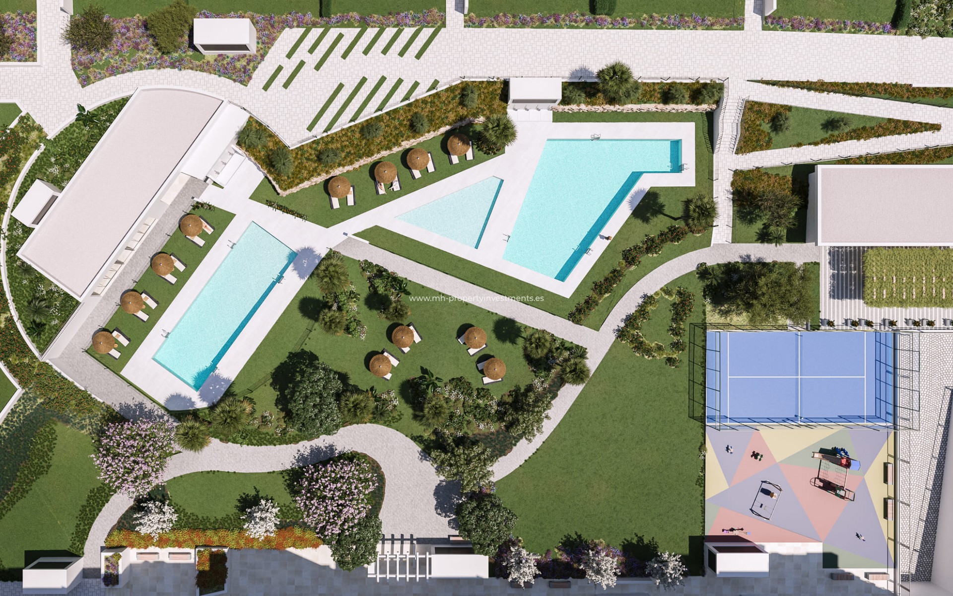 El complejo ofrece una amplia variedad de instalaciones diseñadas para promover un estilo de vida saludable y comunitario. Entre las zonas comunes, los residentes pueden disfrutar de piscinas, un gimnasio, una pista de pádel, áreas de living, zonas ajardinadas y un área de calistenia. Además, se incluye un aparcamiento para bicicletas y locales comerciales en la planta baja, lo que añade comodidad y servicios adicionales. Estos espacios están pensados para que los residentes compartan tiempo de calidad con sus familias y la comunidad, creando un entorno donde se mezcla la innovación con la tradición, en un lugar que ofrece una alta calidad de vida.